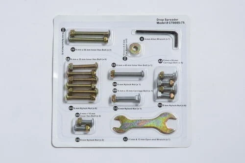 This replacement hardware pack is for the Yardworks® 75 lb. Drop Spreader CT0085-75. It includes a variety of carriage bolts, inner hex bolts, a nylock nut, flat washer, Allen wrench, and open-end wrenches.